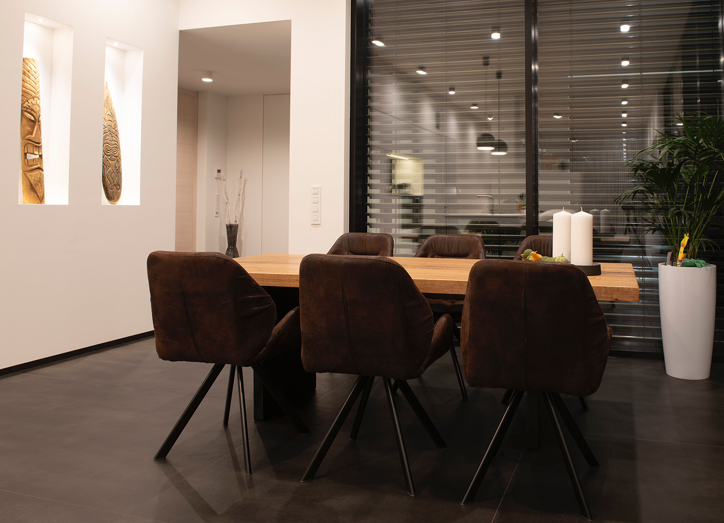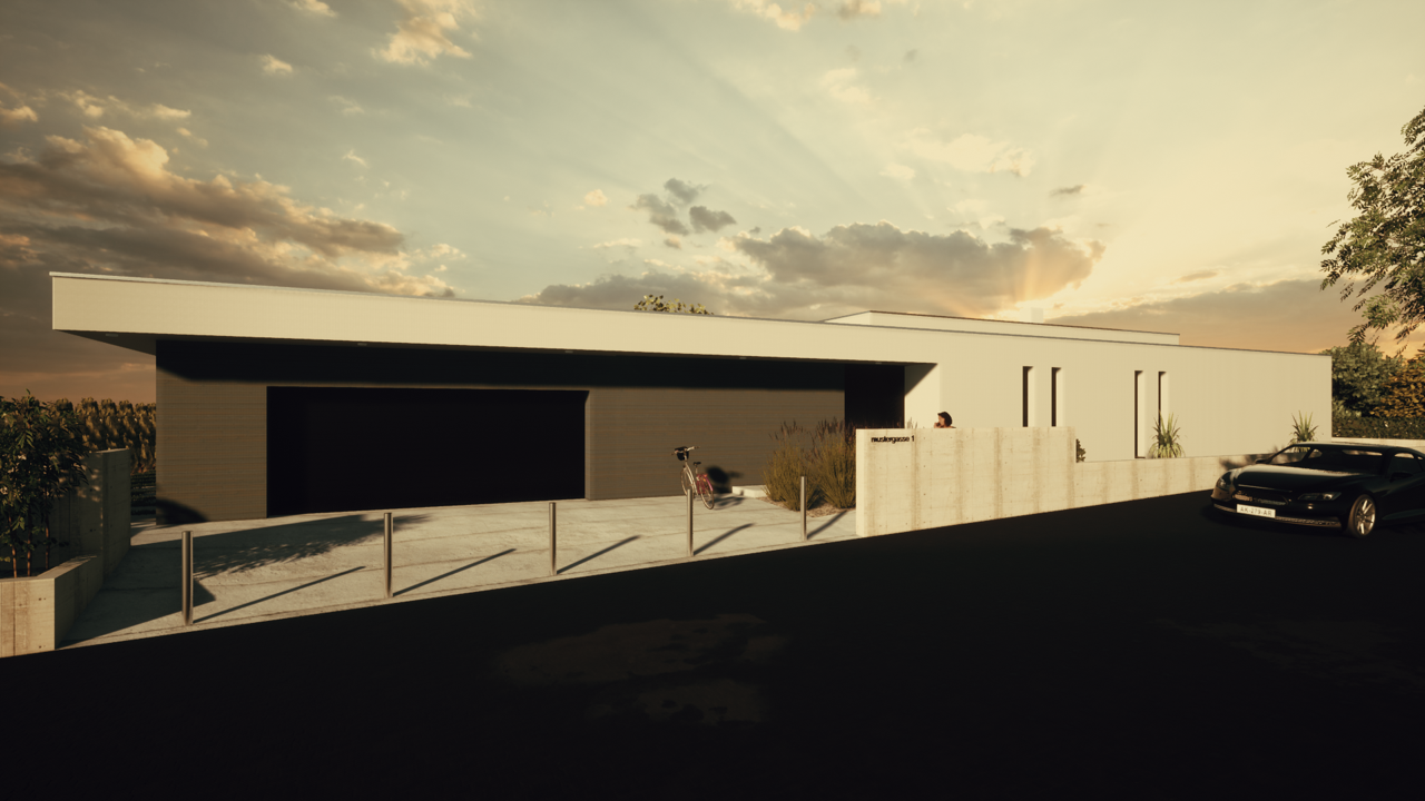 Der L-förmige Bungalow im Bauhaus-Stil passt sich aufgrund seiner Form ideal in die von Vierkanthöfen geprägte Umgebung ein. Straßenseitig gewährt der langgestreckte Baukörper keinen Einblick, doch zum Feld öffnet sich der hohe Wohnbereich dank der raumhohen Verglasung komplett und bietet einen schönen Ausblick auf die Felder, Äcker und Berge, die sich in weiter Entfernung erheben.