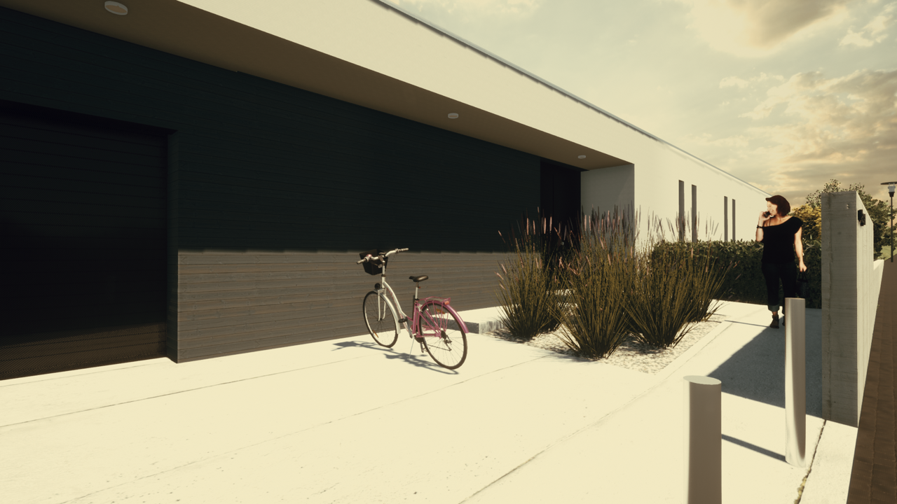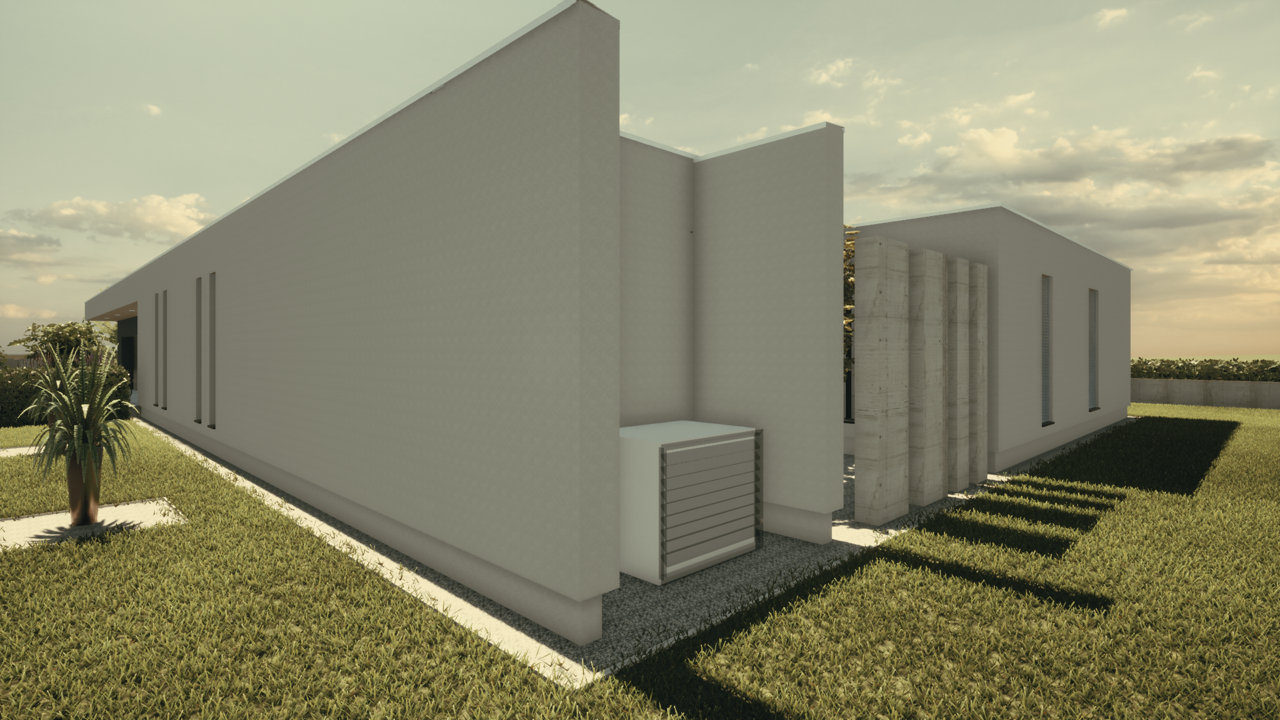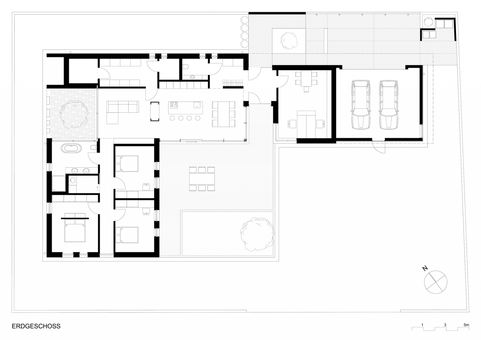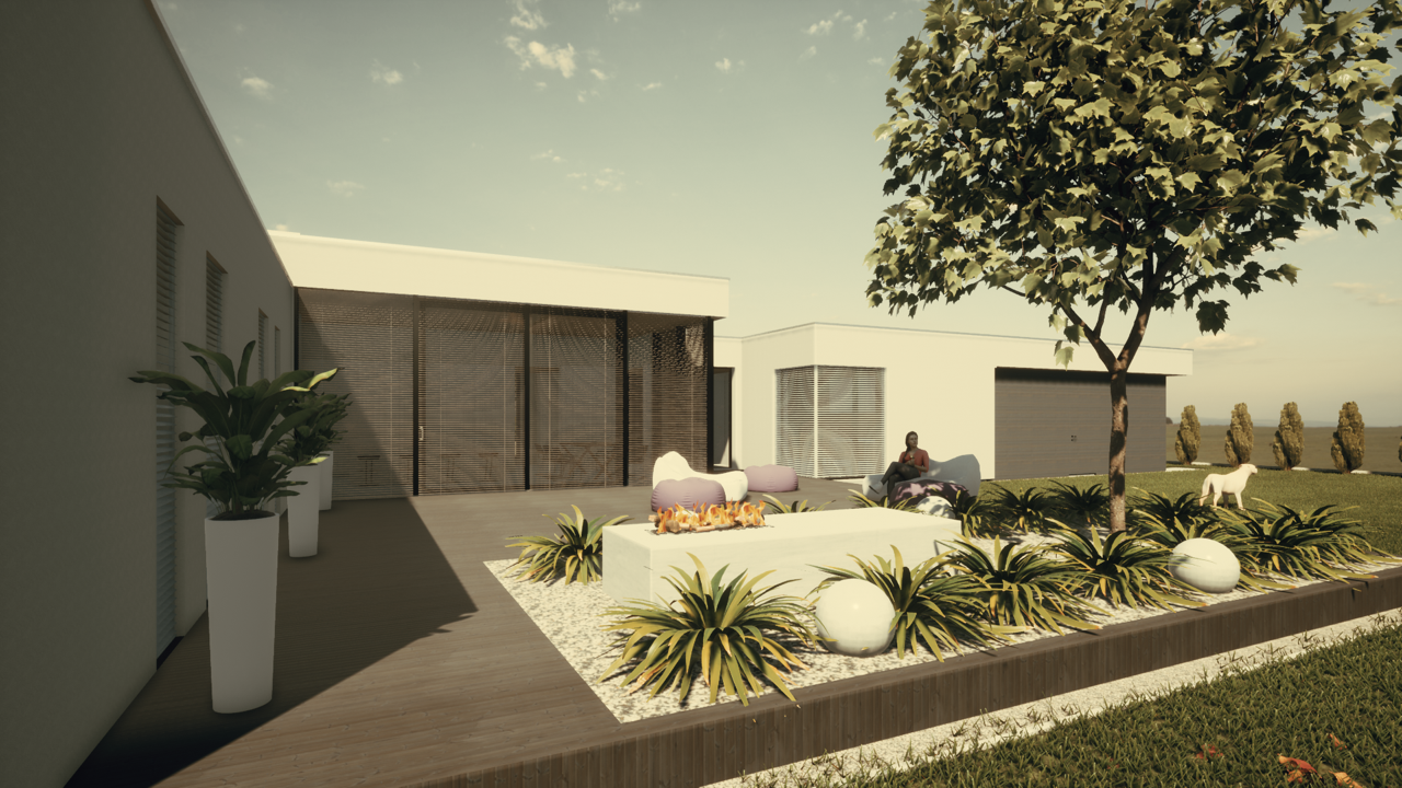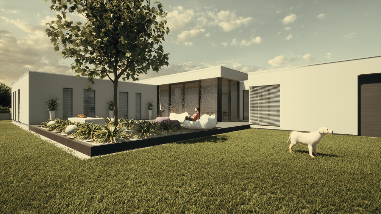 Dem Wohnbereich ist eine großzügige Terrasse vorgelagert, auf welche man sowohl über den Wohnbereich, als auch über den Vorraum und die Kinderzimmer gelangt. An den Stirnseiten des Wohntraktes befindet sich einerseits das Büro und andererseits ein kleines Atrium. Der Privatbereich (Schlafzimmer, Badezimmer) ist im niedriger ausgeführten Schenkel des Bungalows untergebracht. Aus dem Badezimmer genießt man einen großzügigen Ausblick in das angrenzende Atrium – es gewährt jedoch keine Einblicke von aussen. Trotz des hohen Glasanteiles bietet der Bungalow genügend Privatsphäre und Rückzugsbereiche.