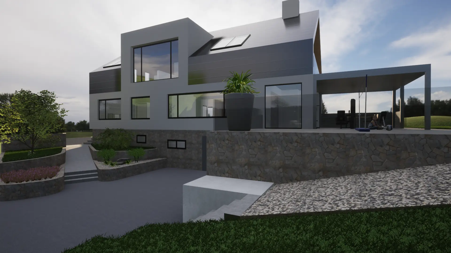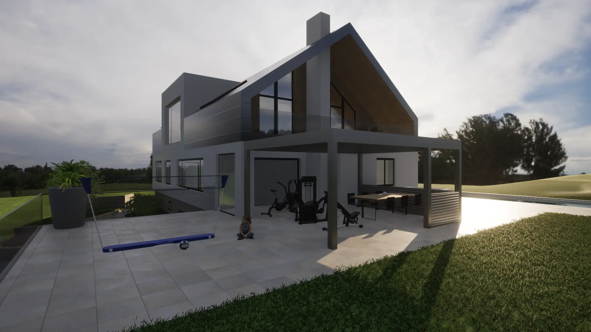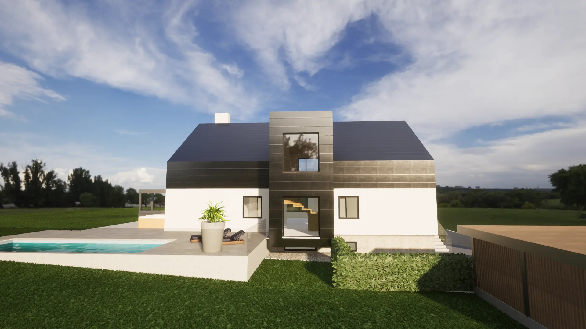 Der schwebende Stiegenaufgang, welcher an der Nordseite des Gebäudes platziert wird, schafft eine elegante Verbindung zwischen dem Erdgeschoss und dem neu ausgebauten Dachgeschoss. Weiters stellt der schwebende Korpus ein Bindeglied zwischen dem bestehenden Wohnraum im Erdgeschoss und der bestehenden Terrasse dar und gewährleistet somit einen bequemen Zugang zum Außenbereich und zum bestehenden Pool. Eine südseitig angeordnete, großzügige Gaube, durchflutet den Dachraum mit ausreichend natürlichem Licht. Die ostseitige Giebelfront öffnet sich mit ihrer enormen Fensterfläche zum Garten, schützt jedoch mit seiner davorliegenden Loggia vor ungewollten Einblicken. Durch eine nachhaltige Bauweise und ein behutsamer Umgang mit dem bestehenden Gebäude wird ein angenehmes Wohnklima geschaffen.
