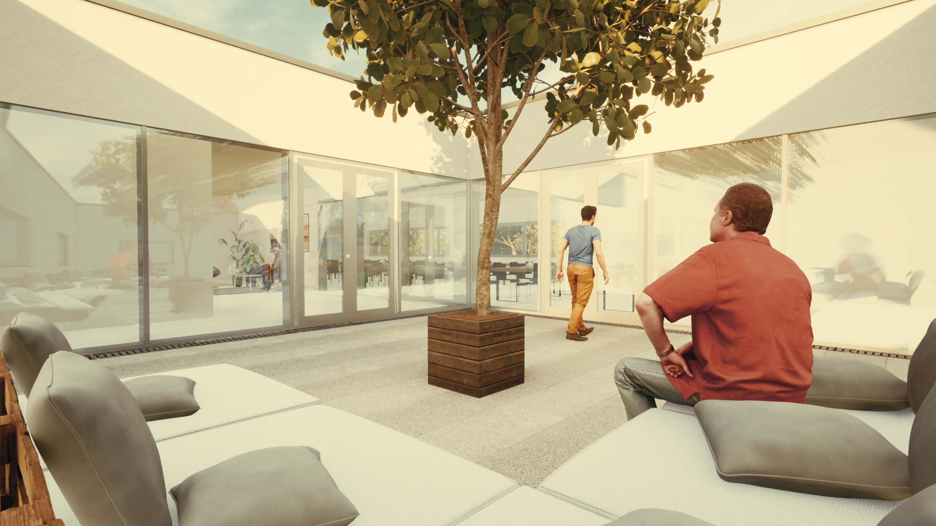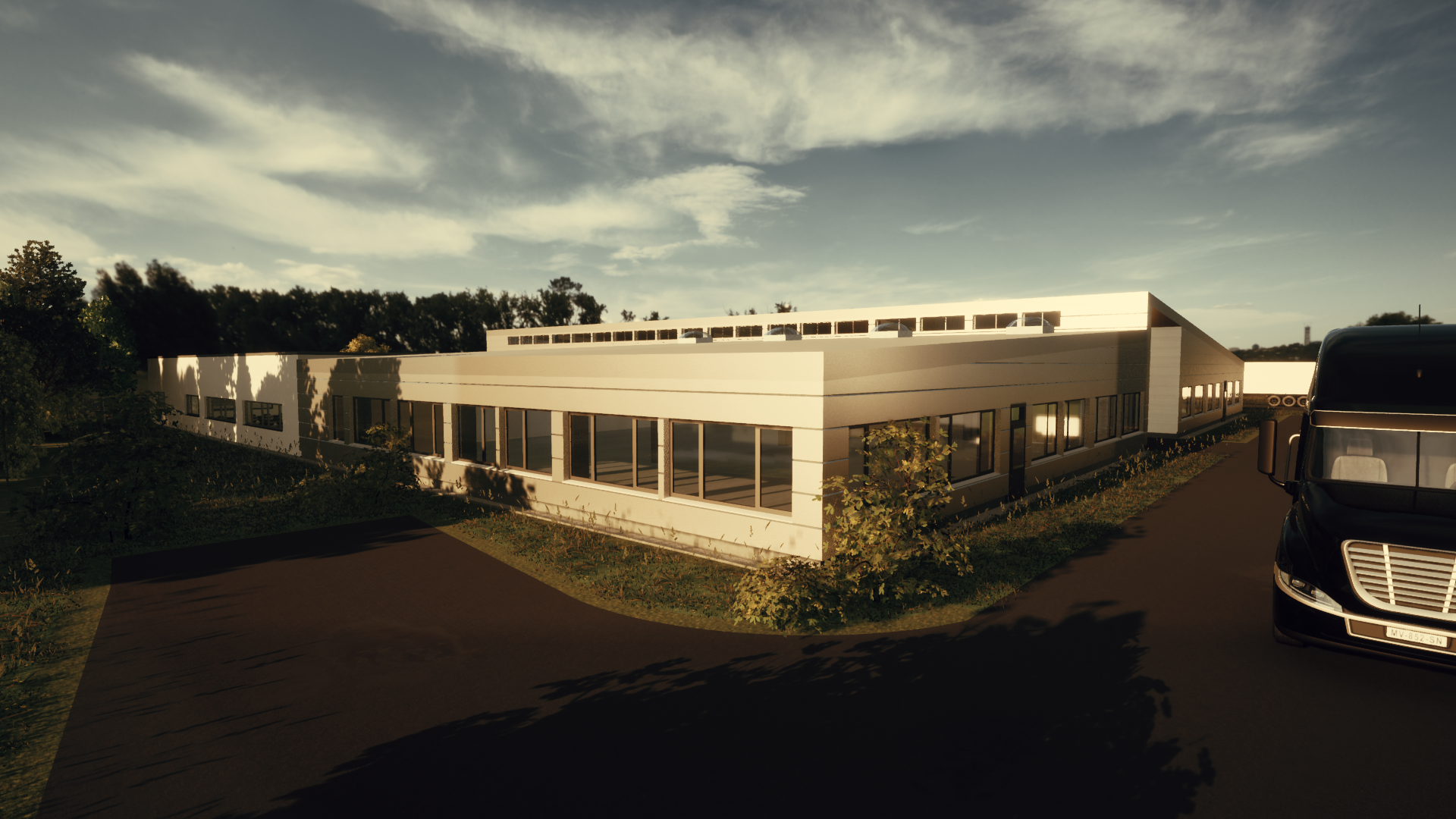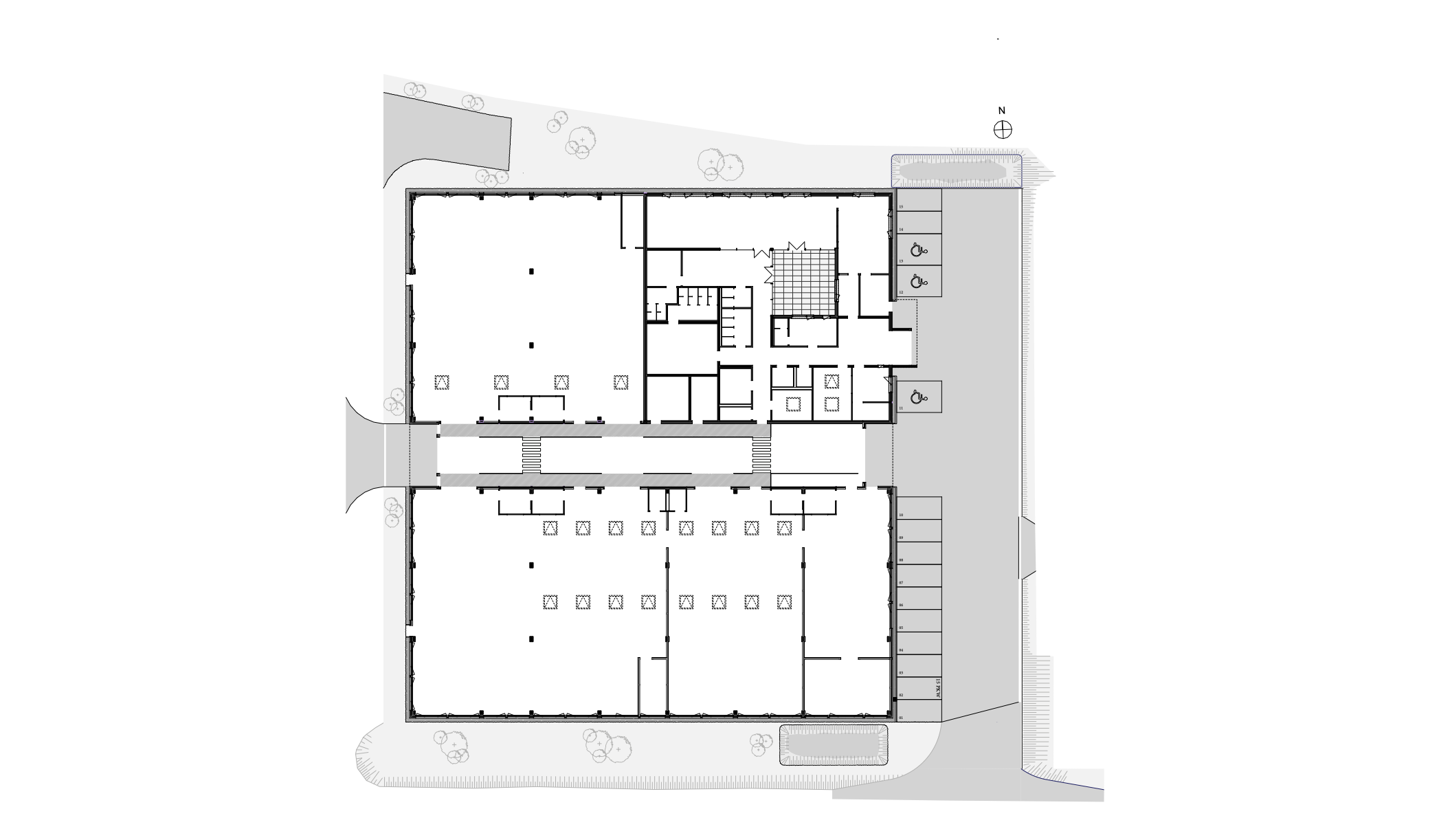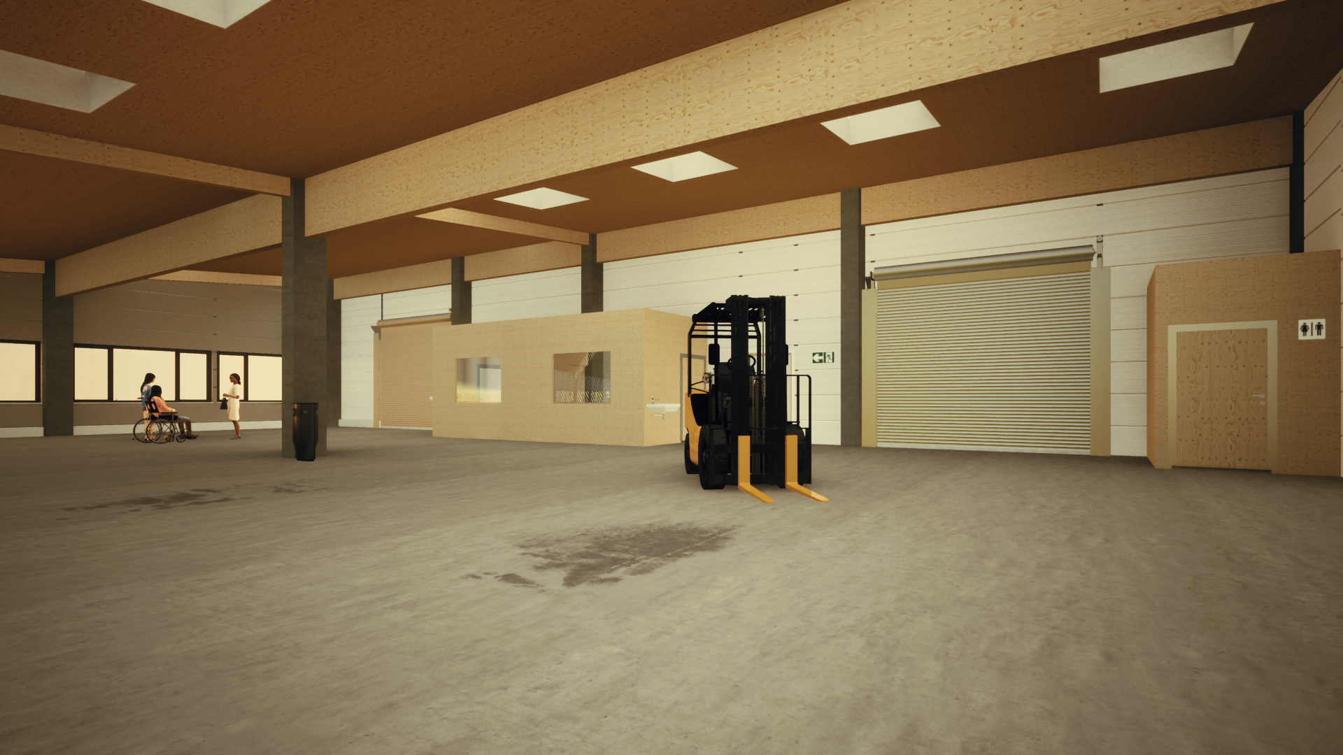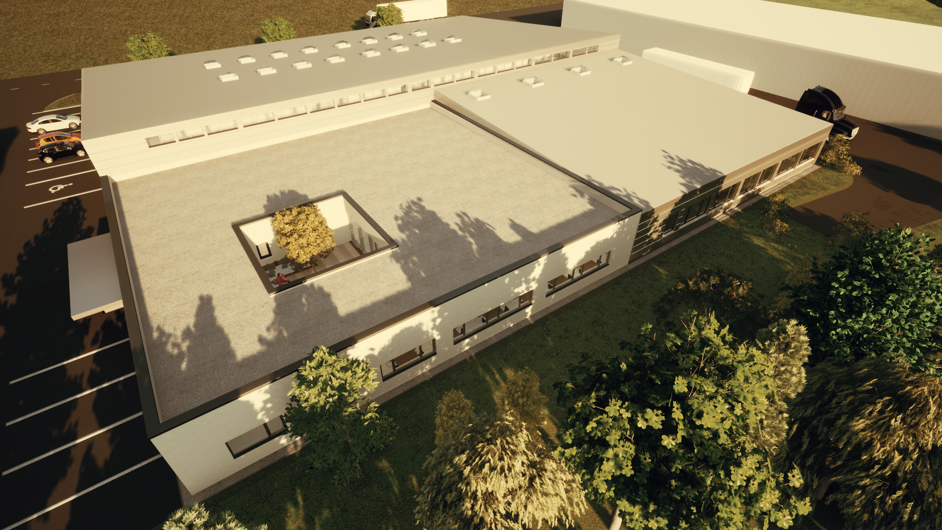 Mitten im Verwaltungsbereich befindet sich ein Atrium, welches sowohl für eine angenehme natürliche Belichtung der Innenräume sorgt, als auch zum Verweilen im Freien einlädt. In den Arbeitsbereichen sind Massivholzboxen eingeschoben, in welchen Leitstellen und Sanitärräume untergebracht sind. Bei der Pultdachkonstruktion kam ebenfalls Holz zum Einsatz, denn diese wurde mit Holzleimbindern hergestellt, welche auf Stahlbetonstützen lasten. Die Deckenuntersicht der Halle wurde mittels gelochter OSB Platten mit Vlieskaschierung geplant und sorgt somit nicht nur für eine optisch angenehme Atmosphäre sondern reduziert auch den Raumschall.